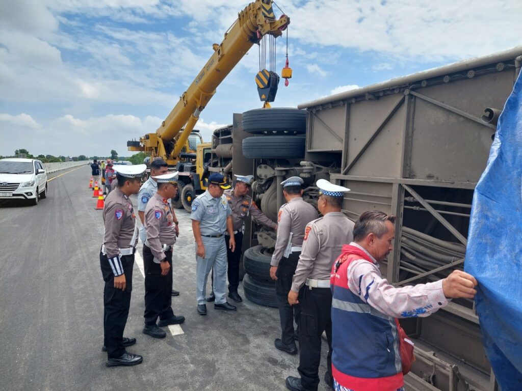Kepala Bagian Operasional, Rudi Elfis, Mobile Service, Virdies Arung Tiranda dan Penanggung Jawab Samsat OKI, Andi Logos bersama Kanit Gakkum Polres OKI, Ipda Hendri Faizal, langsung melakukan survei tempat kejadian perkara (TKP) di Jalan Tol Ruas Terpeka Kapal Betung KM 365+ Kabupaten Ogan Komering Ilir Sumsel yang melibatkan satu kendaraan Bus Miyor BA 7015 JAU pada Kamis, 10 April 2025, pukul 06.41 WIB. Kejadian diduga karena Bus BA 7015 JAU patah air suspension belakang sehingga tidak bisa mengendalikan kendaraanya dan menghantam pembatas jalan dan terbalik sehingga mengakibatkan kernet dari bus meninggal dunia dan supir serta 31 penumpang lainnya mengalami luka berat dan luka ringan.